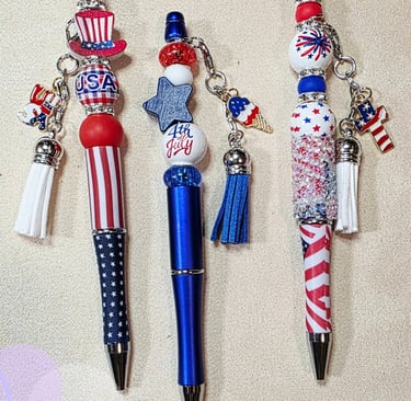 Our handmade beaded pens are not just writing instruments; they are artistic creations crafted with care and precision. Each pen is adorned with patriotic colors and themes that resonate with the essence of the 4th of July. Each pen comes with a free hanging charm that is attached using a lobster claw clasp, making it easy to remove.